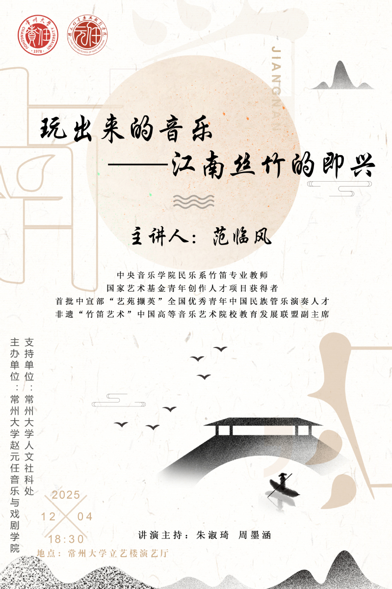 2025年12月4日晚,常州大学西太湖校区立艺楼演艺厅内乐声悠扬,“玩出来的音乐——江南丝竹的即兴”专题讲座在此成功举办。本次活动由中央音乐学院民乐系竹笛教师范临风担任主讲,常州大学赵元任音乐与戏剧学院教师朱淑琦担任主持人。