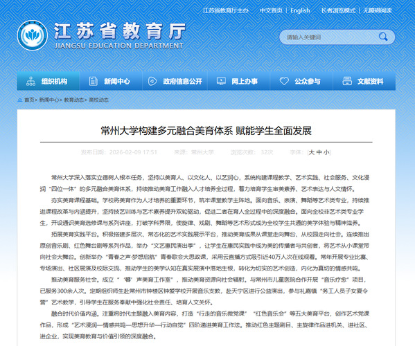 常州大学深入落实立德树人根本任务,坚持以美育人、以文化人、以艺润心,系统构建课程教学、艺术实践、社会服务、文化浸润“四位一体”的多元融合美育体系,持续推动美育工作融入人才培养全过程,着力培育学生审美素养、艺术表达与人文情怀。