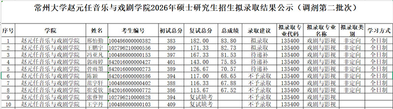 赵元任音乐与戏剧学院2026年硕士研究生招生拟录取结果公示(调剂第二批次)