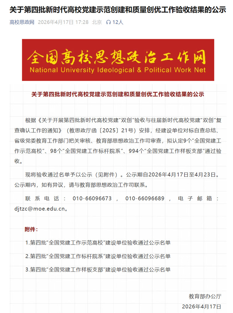 近日,教育部思想政治工作司公布第四批新时代高校党建示范创建和质量创优工作验收结果。根据《关于开展第四批新时代高校党建“双创”验收与往届新时代高校党建“双创”复查确认工作的通知》(教思政厅函〔2025〕21号)安排,经对标自查总结、省级党委教育工作部门把关审核、教育部思想政治工作司审查,我院师生党支部顺利通过验收。